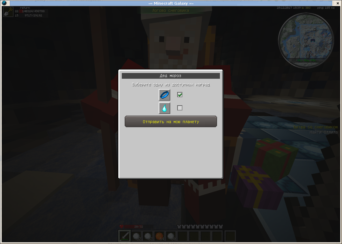 Только в Новый год открытки (а точнее их обрывки) падают с Гоблинов, Слизней, Злобных подарков и Ледяных големов. Шанс дропа достаточно высокий - 50%, однако построить спавнеры и собрать мешки открыток на этот раз не получится. Количество дропа ограничено чанком и если в данном чанке выпало больше определенного количества открыток, то падать они перестают вовсе до следующей перезагрузки сервера. Поэтому тем, кто захочет получить валюту убийством мобов придется постоянно перемещаться по карте и искать территории с мобами, в которых еще не охотились другие игроки.