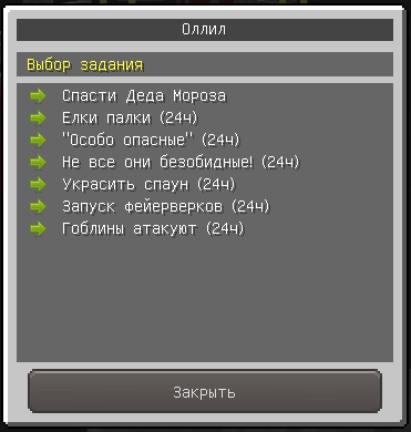 В одном задании игрокам предстоит принести ресурсы для помощи с крафтом, в двух других ОллиЛу необходимо будет помочь с украшением спавна, а в остальных - сразиться с мобами. Все задания достаточно простые и за их прохождение игроку дается некоторое количество открыток, на которые игрок может обменять новогодние товары у все того же ОллиЛа: