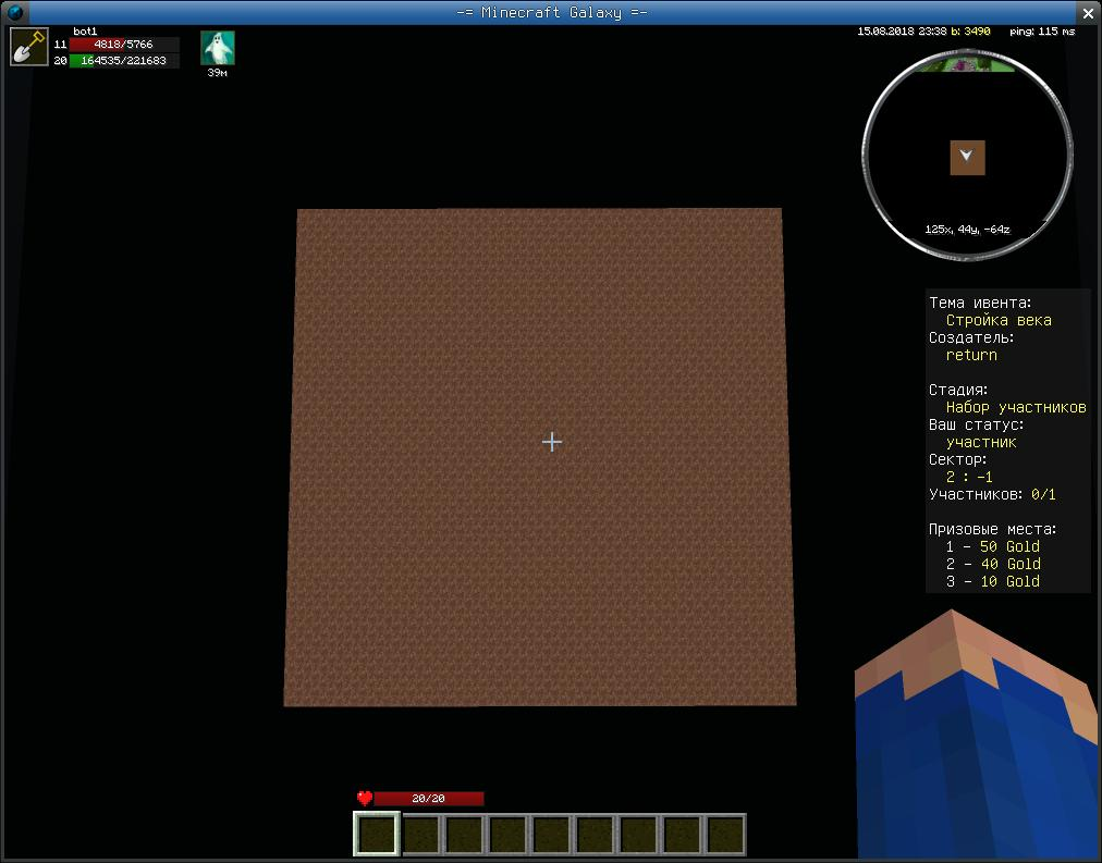 Набор: на этом этапе все игроки подключаются в качестве спектатров, однако если игрок является участником, то для него автоматически создается так называемый "сектор" - виртуальная зона, в которой данный игрок сможет возводить свою постройку на этапе строительства. Участники при этом появляются в своих секторах, а все остальные в центре карты.