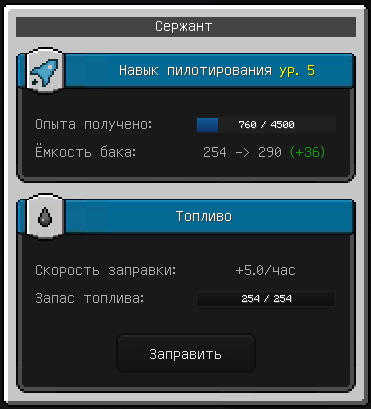 Уровень навыка повышается с получением опыта после прохождения данжей. Топливо же наполняется в канистры автоматически и скорость наполнения указана на этой же вкладке. Эта скорость и объем бака зависят от уровня пилотирования игрока и от его группы. В дальнейшем появятся еще два способа пополнения топлива - за Gold и путем производства из нефти на заводе.