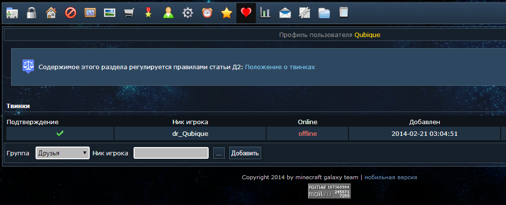 лидера клана о намерении создания (или о уже созданных) твинкахТвинк - аккаунт, чей IP(сетевой адрес) и информация о компьютере совпадает с данным..7.3. Так же не забывать о существующем Положении о твинках проекта MCGL.