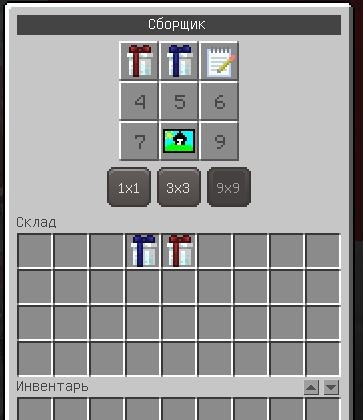 В сборщике в образцах делаем упакованный подарок - для этого нужно взять упакованный подарок без разницы чем и кликнуть в образцы сборщика. В подарок можно упаковать практически любой предмет в МКГЛ не содержащий слотов и сборщик его заберёт. Так же для писем укажем блокнот в образцах сборщика. В остальные образцы можно сделать любой другой ресурс который вы пожелаете, но подарок и блокнот обязательны.