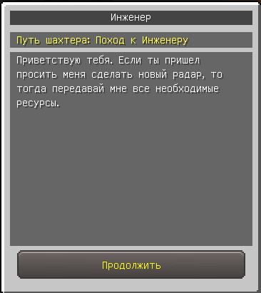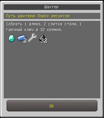 Раздобыв алмаз, 2 стали, гаечный ключ и 32 кремня, вернитесь к NPC Шахтёру, он попросит вас сходить к NPC Инженеру