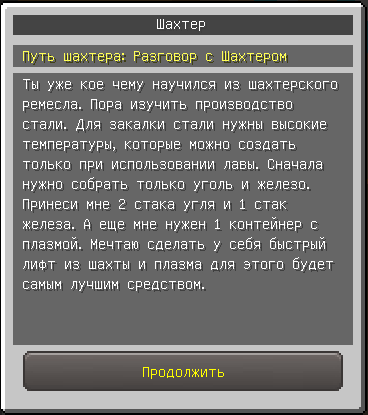Раздобыв 128 угля, 64 железных слитка и контейнер с плазмой, вернитесь к NPC Шахтёру