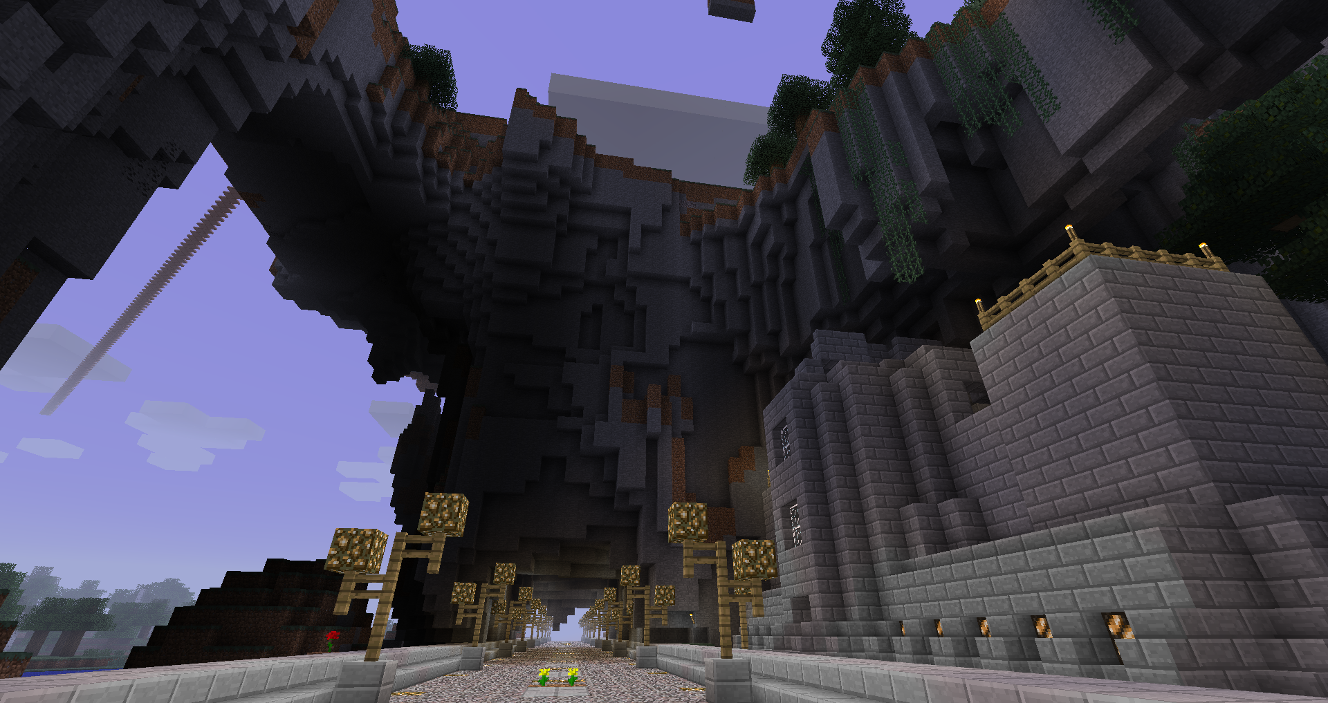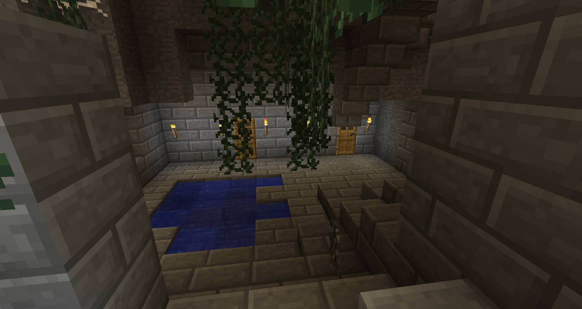 Авто вайп задел часть горы и там образовалась дыра. Сосед, который подселился рядом, до дороги сделал из каменного кирпича проход. Ну я немного поработал с дорогой и сделал что-то типо разрушенные руин, ведущих к его дому. Надо было сделать скрин "ДО", что бы было понятно и склеить два скрина, до и после. Тогда бы вы наверняка поняли фишку постройки. По этому мой косяк вышел. Вон где двери и заканчивается вода - идет чужой приват. |