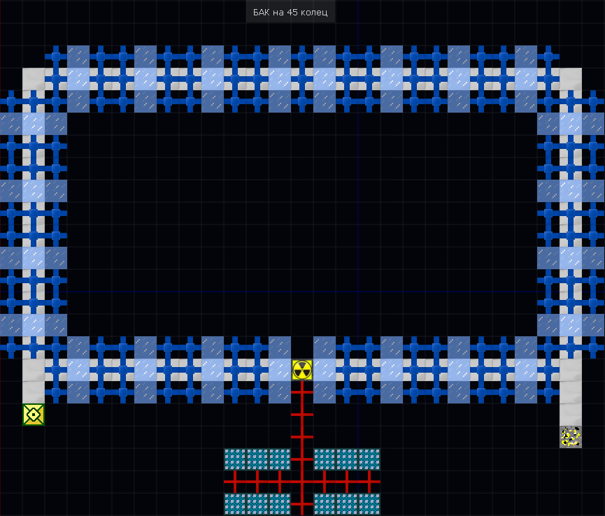 Ранее для использования многоколечного "бутерброда" с модулями мной был разработан и изготовлен БАК на 38 колец: http://forum.minecraft-galaxy.ru/topic/94980, но его конструкция не подходит для одиночного источника, так как у этого БАКа занижена энергия частиц (учитывалась повышенная энергия частиц из модулей). Этот БАК и предлагаемый мною 45-колечный являются, по сути, "полутрубчатыми". Так как для многоярусного строительства сплошные разгонные кольца "трубочника" были разделены для возможности заливки льда.