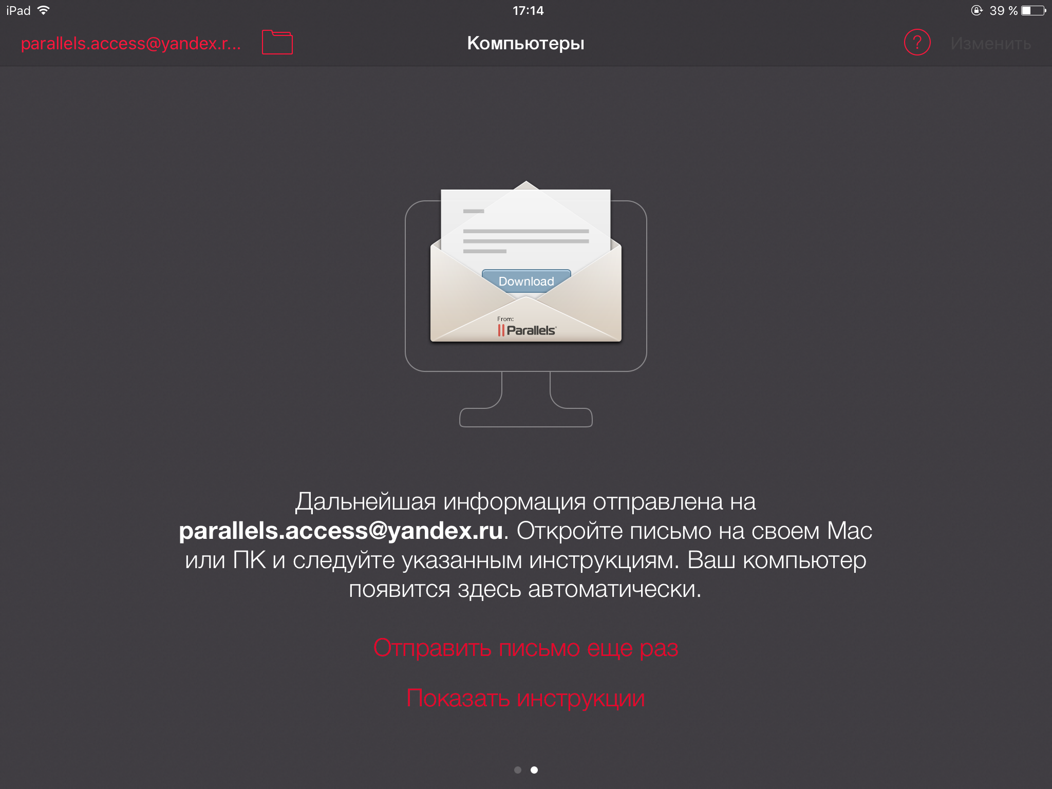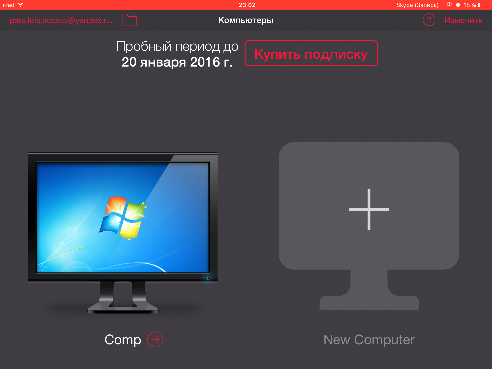 Parallels Access — это программа для удобного доступа к вашему компьютеру Mac или ПК со смартфона или планшета под управлением iOS. Установить программу можно из магазина приложений бесплатно, после установки и регистрации вам дается 7 дней пробного периода, после чего нужно оплатить подписку 649 рублей/год. Дабы ничего не платить, после пробного периода можно создать новый аккаунт и использовать его, так как вам снова дадут пробный период.