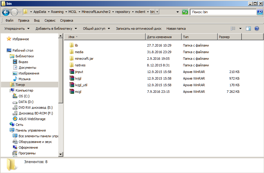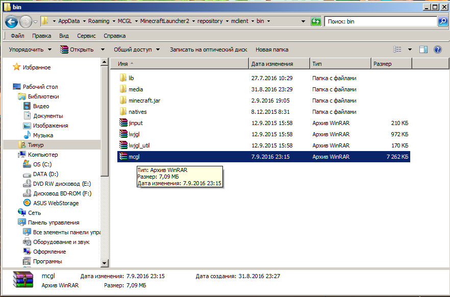 (В моем случае папка храиться в C:\Users\Тимур-ПК\AppData\Roaming\MCGL\MinecraftLauncher2\repository\mclient\bin)