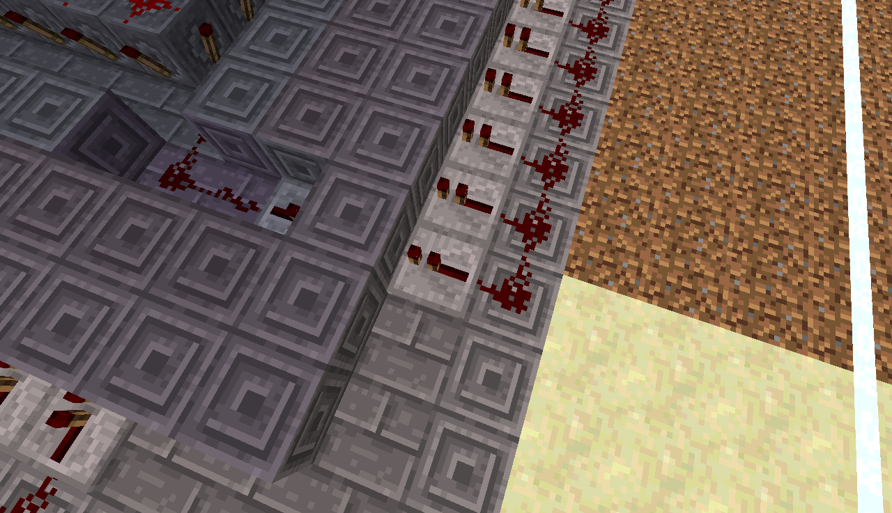 21.Возвращаемся к питающему углу. От верхнего факела ведем линии редстоуна, добавляя повторители. Таким образом мы должны запитать все верхние поршни.