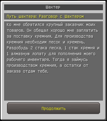 NPC Шахтёр попросит вас принести ему 128 песка, 64 кремня и алмазную лопату