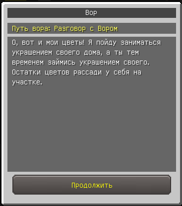 Рассадив 25 одуванчиков и 25 роз, вернитесь к NPC Вору, для продолжения обучения