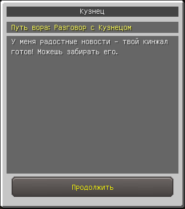 По истечению времени вернитесь к NPC Кузнецу, он даст вам кинжал