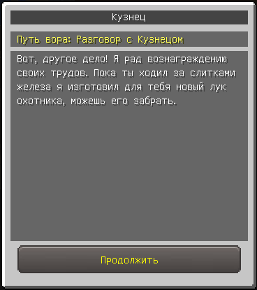 Раздобыв кожаные поножи, 2 заплатки, белую шерсть и 10 слитков золота, вернитесь к NPC Вору, он попросит вас сходить к NPC Кузнецу