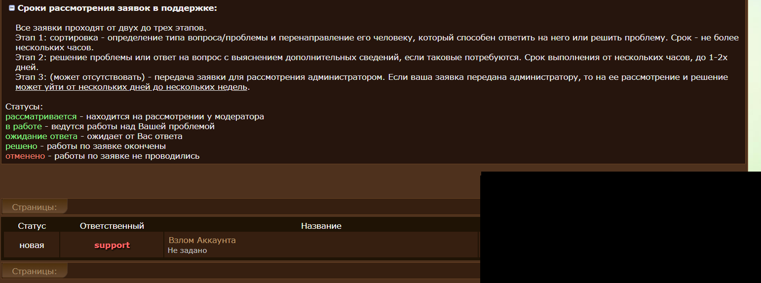 dronzh1997 писал(а): Вполне же достаточно хотя бы по часу в день уделять внимания заявкам.. Не,конечно возможно если верить тому,что написано в вики,типо заявки рассматриваются по очереди. То такой интенсивностью ответов уже накопилось очееень много заявок,и по этому так долго приходится ждать ответ от суппорта.. Тем кто не сталкивался с этим,вам очень повезло, т.к. сидеть в заморозке за просто так и ждать ответа от суппорта уже 23 дня совсем не в кайф.. Как по мне сделали бы тогда компенсация за то,что долго приходится сидеть и ждать..Как пример, у меня ломанули акк. Вынесли на всех серверах все что было в инвентаре (повезло что не был нигде прописан). В тот же день написал заявку на взлом аккаунта, прошло уже 4 дня а статус так и не сдвинулся. Мне вот интересно для кого они это сочиняли? Если сами же своих правил не придерживаются... Учитывая что ресы мне врятли вернут, т.к. за такое время они разлетелись (половину из них успел выкупить). Самое не приятное что виновник до сих пор играет |