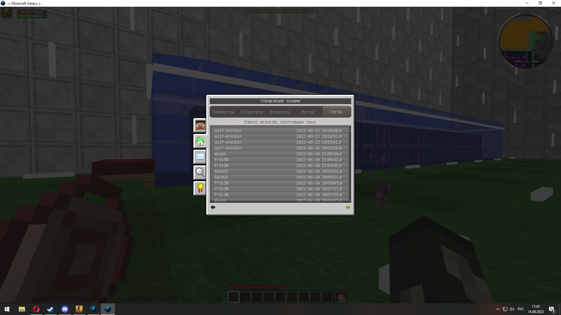 Pasha писал(а): petyh228, привет. У тебя в городе стоит зона дома, проверь гостей (дом за стены города не выходит), там будут только те, кто проник. Подай заявку сюда: https://forum.minecraft-galaxy.ru/dispute/ - с пометкой объяснить как был совершен взрыв.Дом друга и я там не прописан. Вечером будет скрин |