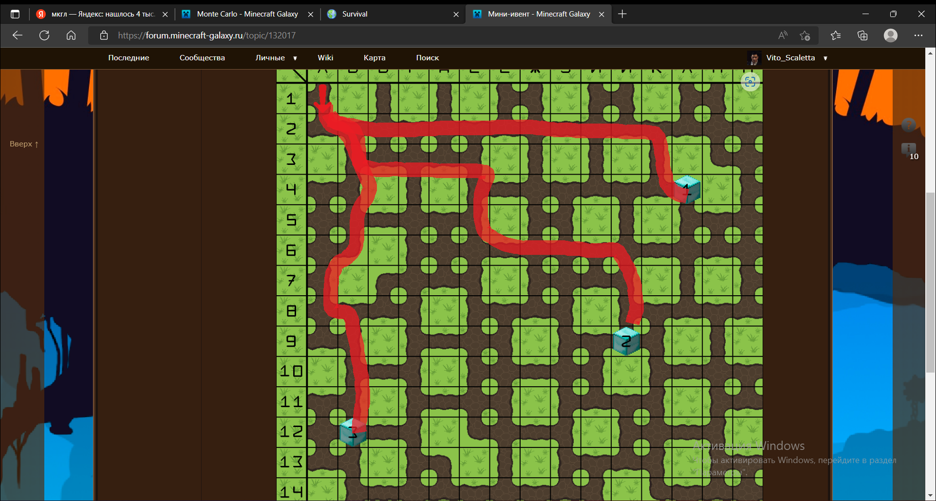 Перед вами мини-игра "сапёр" где будет решать ваша интуиция и удача. На карте 3 призовых клетки, каждая из которых равна стаку аб. Вы можете строить путь до всех сразу от старта. Вы можете выиграть как все 3 стака, так и один. Призовой фонд был сложен из аб с консенсуса в сообществе обманщиков, владелец которых не явился в срок и моих личных для того, чтобы призовой фонд не был слишком скуден. Сами аб будут выдаваться на сервере Nano, с бендером по желанию.