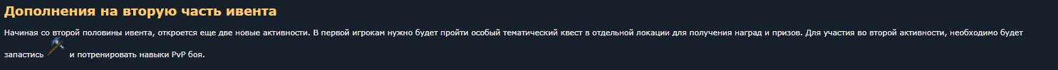 Kupidon4ik, Ивент на прохождение(данж) будет немного позднее. Для его реализации требуется дописать функционал, позволяющий быстро и в максимально удобной форме работать с игровой логикой. Это получается его введут как отдельный дополнительный ивент или позже означает что возможно ближе к хелуину 2026? Редактировалось 1 раз(а), последний 2025-11-11 16:15:13 Позже это значит когда по кайфу тогда и добавят |