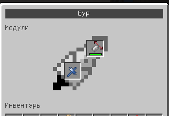 Новое диалоговое окно, которое можно вызвать клавишей F, держа бур в руках, отвечает за его кастомизацию. Верхний слот отвечает за вставку насадок и головок буров, которые влияют на форму и эффекты разрушений блоков. Нижний слот отвечает за вставку модулей, которых на данный момент всего 2: