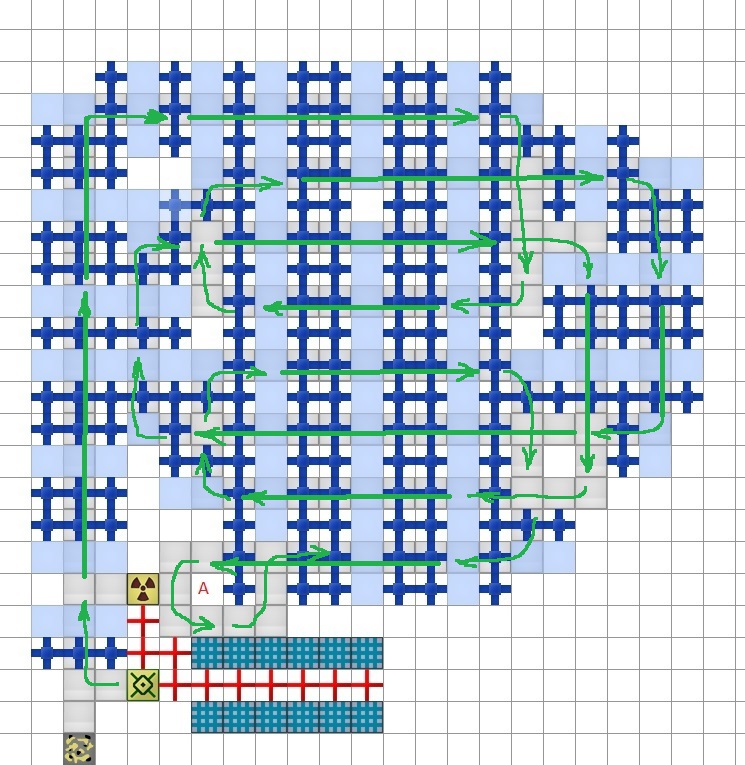 Частица, выйдя из источника, начинает последовательно проходить все кольца коллайдера, ни разу не проходя через них дважды. Дойдя до кольца А частица разворачивается не пересекая терминал и идёт обратно, но уже через другие кольца. На выходе из БАКа частица бьёт в уран, синтезируя плутоний, как и в обычном БАКе.