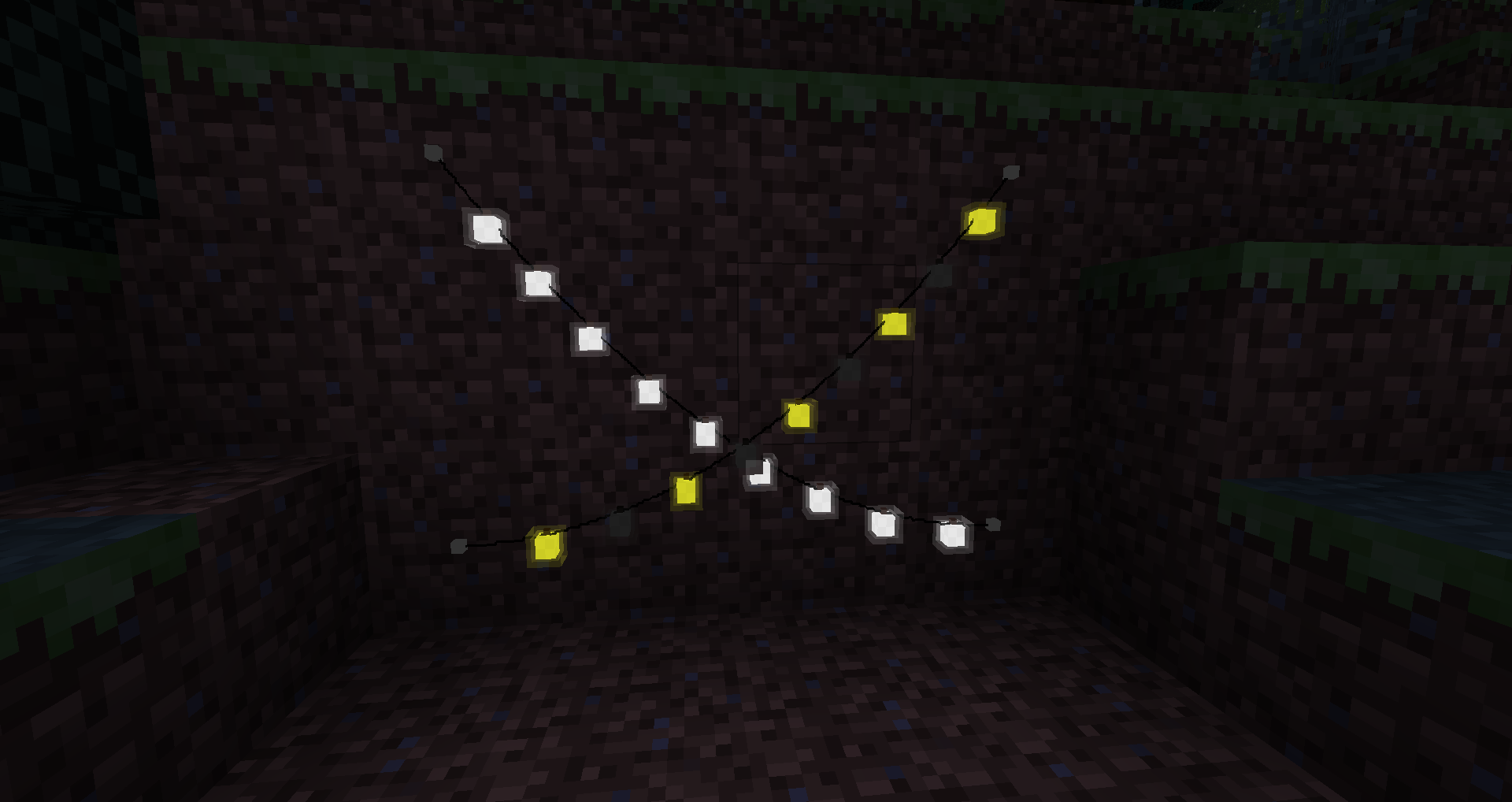 Для установки потребуется взять гирлянду в руки и нажать на 2 блока. 1 блок: начало нашей гирлянды. 2 блок: конец. Гирлянду можно вешать как короткую (2 блока), так и длинную (16 блоков)(?). Вешается на стены и потолок.