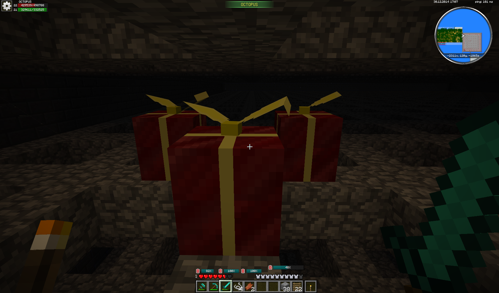 Не буду жмотом и скажу, что проще засыпать подарки залпом снежков(зажать ПКМ), вместо ударов рукой. Так гораздо быстрее их открывать.