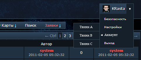 Предлогаю добавить раздел в меню (В правом верхнем углу) - Аккаунт. И поддразделы слева, для ников твинков.