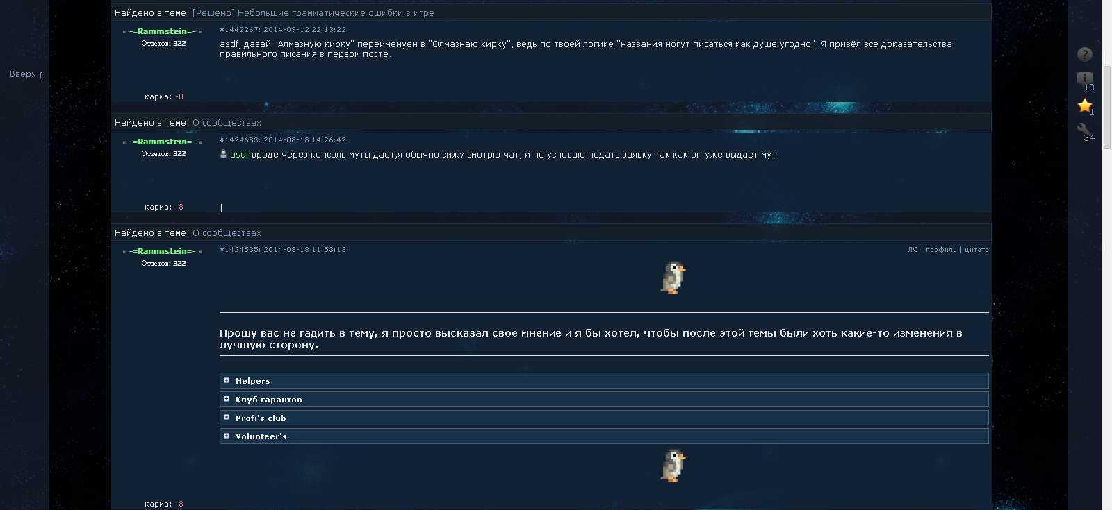 Иногда нужно посмотреть все свои посты, или посты другого игрока, но искать их через поисковик очень нудно, и долго. Поэтому предлагаю ввести такую функцию, что при нажатие на кол-во сообщений, показывались все посты данного игрока.
