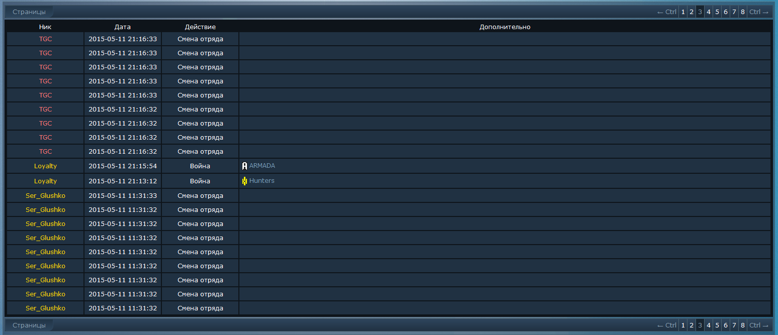 Иногда (причина неизвестна) могут появляться в логах клана записи о смене отрядов у целой группы игроков, причем, в отличие от реальной смены отряда, записи не имеют комментария о том, кому сменили отряд и на какой, а также появляются почти одновременно.