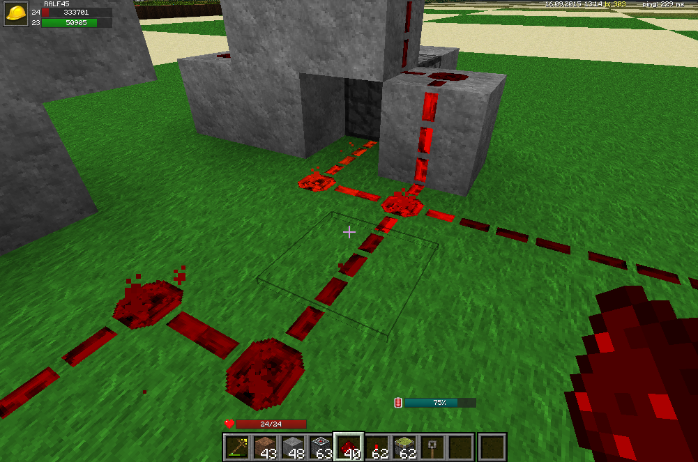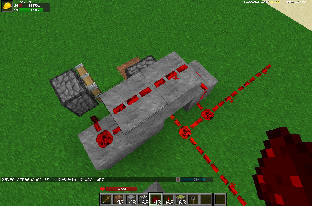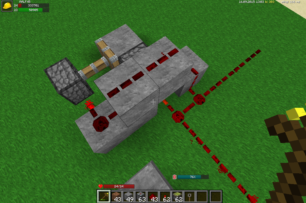 На скрине: липкий поршень, детектор с камнем внутри, церь редстоуна со слабым сигналом (на последнем блоке цепи видно что сигнал заканчивается).