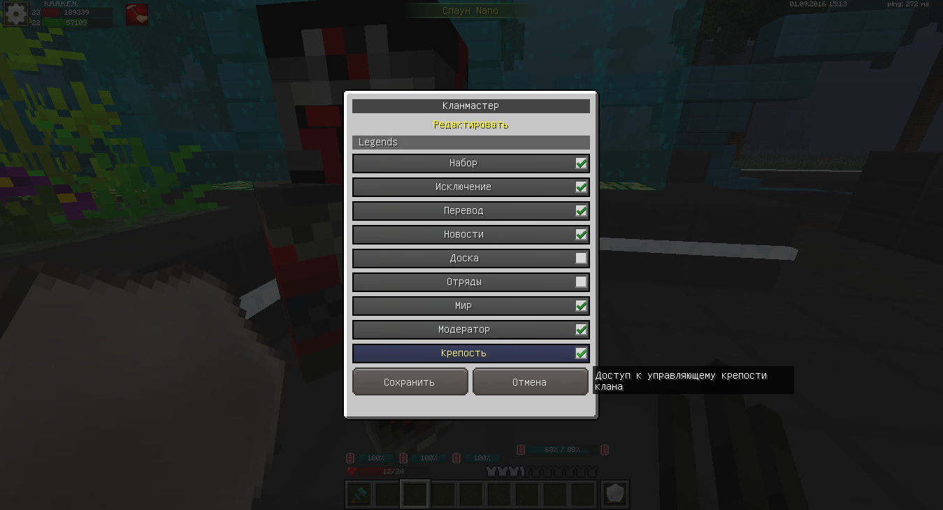 Галочка доступа к управляющему крепости в настройках отрядов имеется только в игре, в клан мастере.