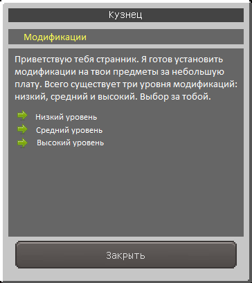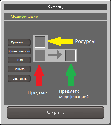 NPC Кузнец: Существует три уровня модификаций: низкий, средний и высокий. И пять видов: прочность, эффективность, сила, защита и свечение(свечение не может быть установлено на броню). Свечение подобно