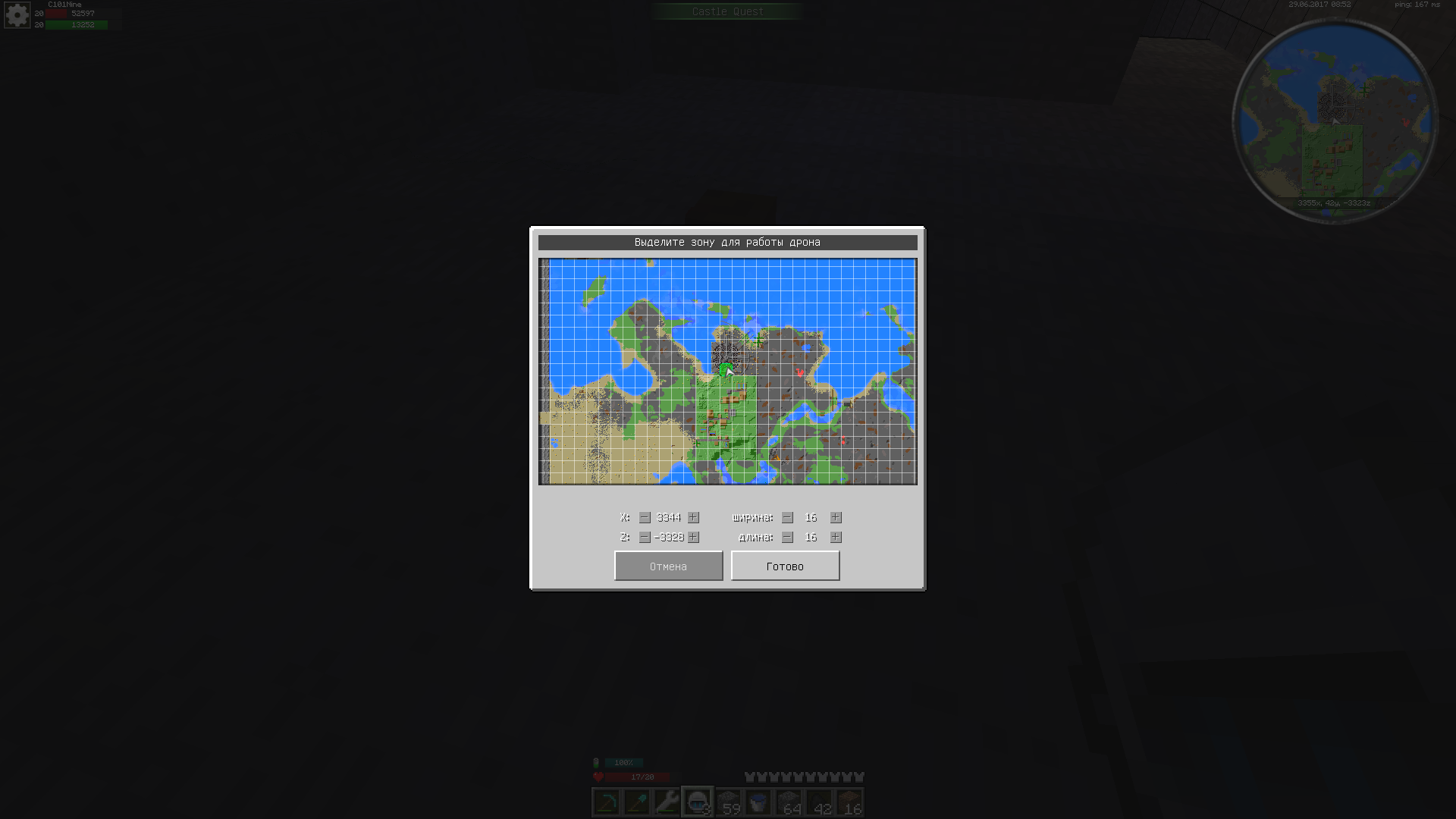 Следовательно, что бы дрон копал ровно чанк, требуется установить область работ с длиной и шириной = 16