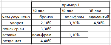 (3.3% + 3.3% + 2.1%)/3 + 1.1% получаем по каждому параметру переходящих нагрудников, соответствующие своим хар-кам то есть - нагрудник 4го лвл будет выглядеть как на простом улучшение сета таким образом Уворот 4.0, использовано 3 вольфрама + 1 бронза.
