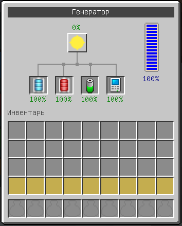 Генератор отображает на стенках полоски, обозначающие уровень заряда предметов. Предметы не способные хранить заряд не отображаются на стенках генератора.