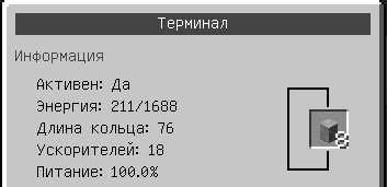 Активен: Да/Нет — состояние работоспособности коллайдера Энергия: 211/1688 — мощность, выдаваемая коллайдером за 1 круг прохождения частицей и мощность за несколько кругов (количество кругов на 1 больше количества блоков в ячейке) Длина кольца: 76 — длина основного кольца коллайдера Ускорителей: 18 — количество колец сверхпроводников Питание: 100% — процент оставшегося заряда батареек в генераторах