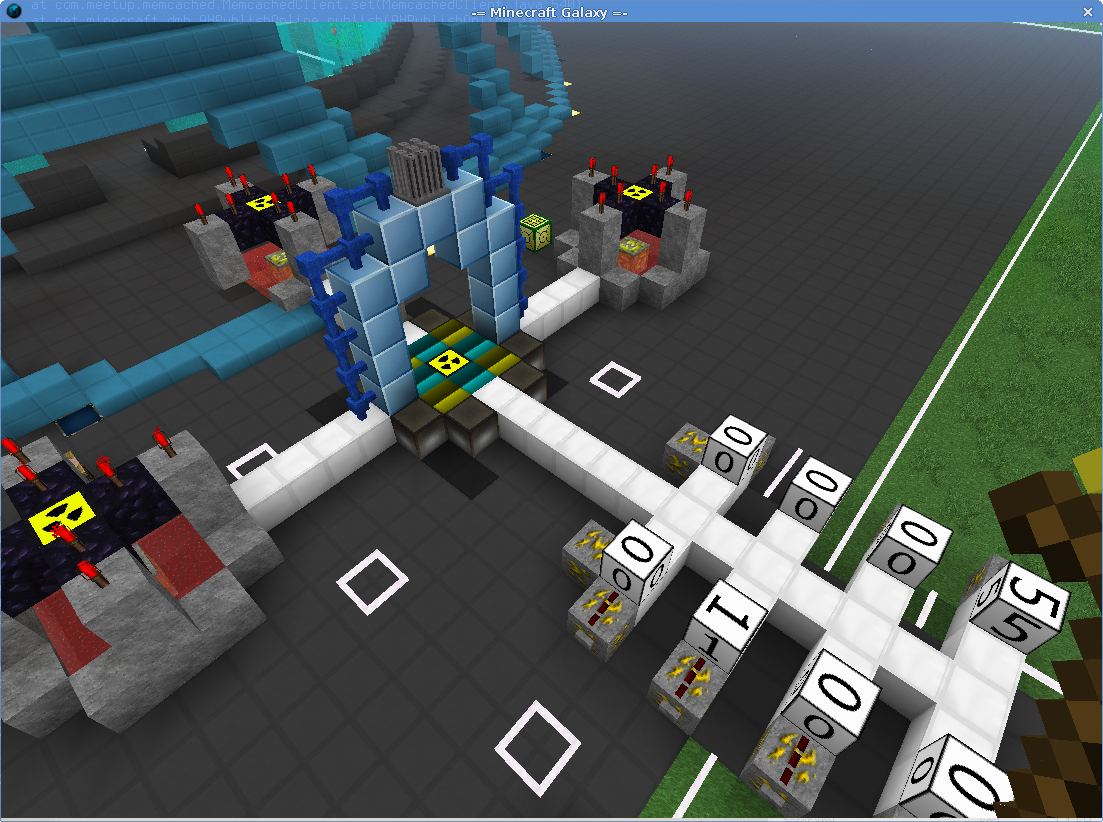Ближний ряд (справа от центра) счетчиков обозначает координату Z, дальний ряд - координату X (в зависимости от расположения управляющей платформы, расположение координат может быть обратным). Координата Y всегда равна 70. Для указания положительного значения перед левым счетчиком ставится любой блок (в данном примере блок земли), для отрицательного значения блок не ставится. Можно заметить что на скрине телепорт настроен на координаты -2162,70,1531. Телепортация игрока будет произведена при отсутствии в том месте зоны или наличия прописки в ней.
