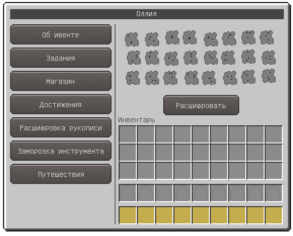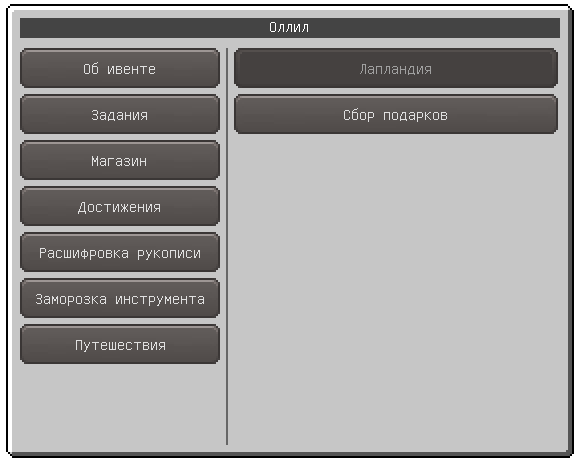 Получая новогоднюю валюту за квесты и с мобов, игрок имеет возможность потратить их в магазине у ОллиЛ`а на дополнительные предметы и ресурсы. Ежегодно ассортимент магазина пополняется.