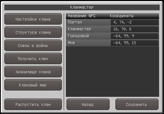 Страница, доступная по нажатию этой кнопки позволяет указать расположение 4х основных NPC в клановом мире. Если у клана не приобретена опция Управление NPC или была отключена, то игроки не смогут открывать диалоги с ними.