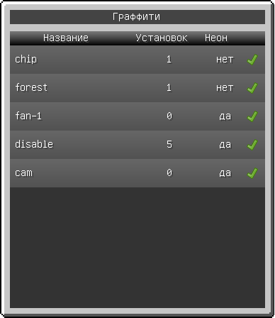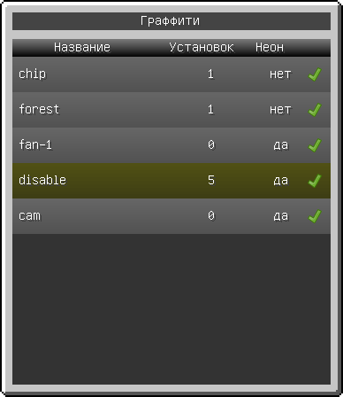 Для установки граффити в игре нужно взять граффити в руку и зажать ПКМ, после чего появится окно с доступными для установки изображениями. Клик по выбранному названию покажет саму картинку, а клик по галочке справа от названия сделает указанное изображение «текущим», то есть при установке граффити будет отображаться именно оно.