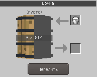 Для наполнения бочки необходимо открыть интерфейс, вставить контейнер и нажать "перелить":
