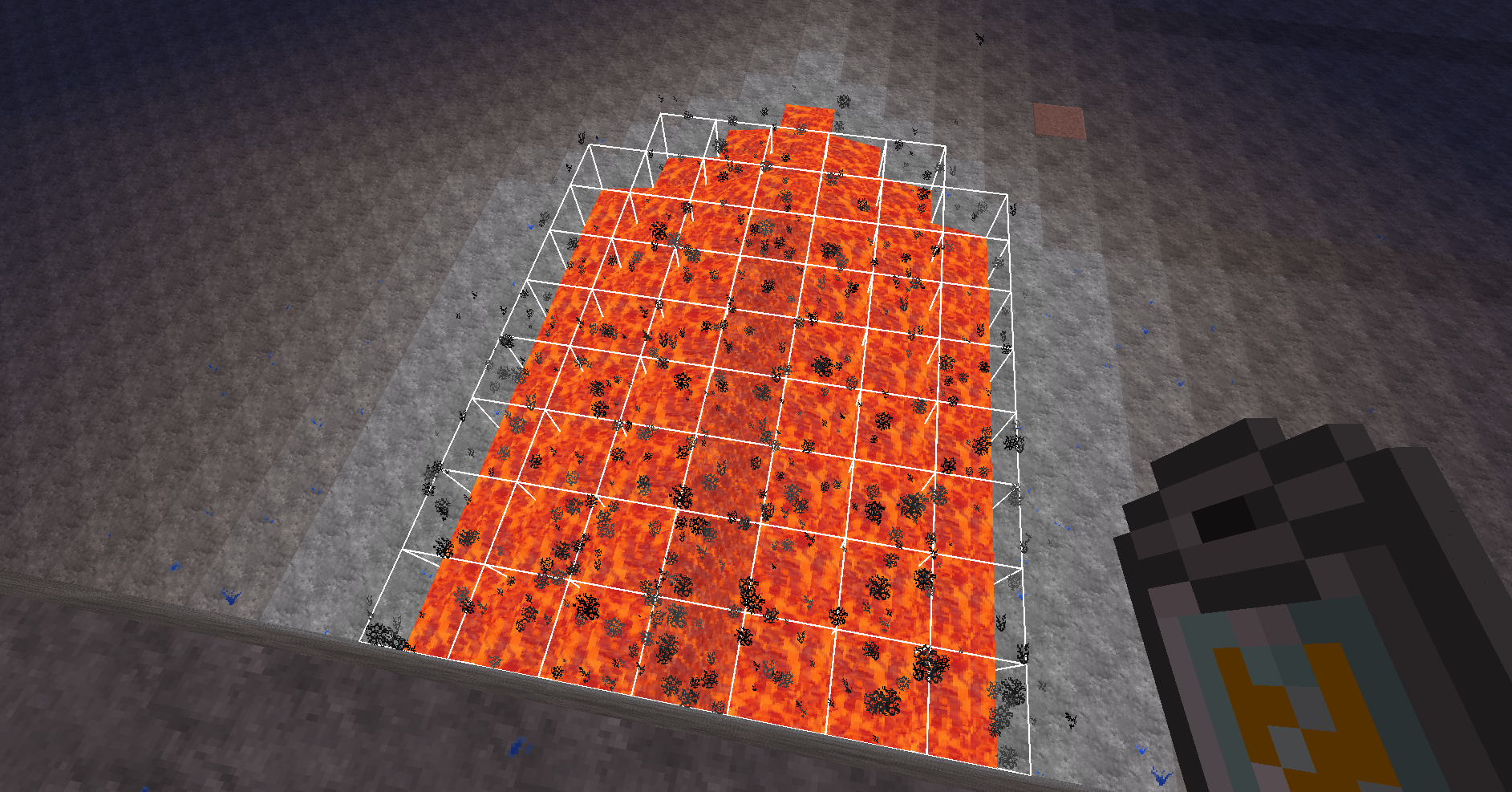 Для удаления блоков лавы и нефти необходимо взять аннигилятор в правую руку и навести на сами жидкости. При наведении появится сетка, указывающая на то, какие блоки будут удалены: