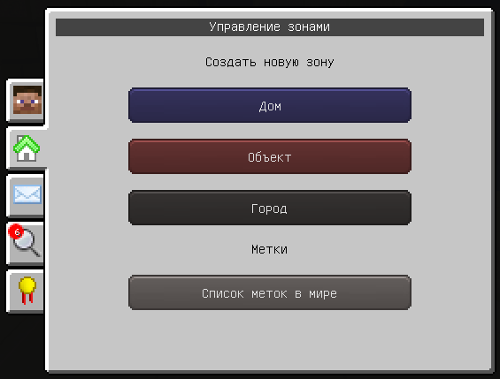 Зоны, также известные как территории, приваты или регионы, представляют собой занятые территории, которые ограничивают взаимодействие с блоками и предотвращают несанкционированный доступ к хранилищам игроков. Когда игрок строит дом, он устанавливает свою точку возрождения внутри этой зоны. Город же предоставляет возможность использования ядерной энергетики. Объект похож на дом, но не имеет точки возрождения и может быть установлен только игроками с группами premium и platinum. Некоторые зоны могут быть мирными, что означает ограничение урона по всем живым существам, а также то, что криперы и динамит не разрушают окружающие блоки при активации.