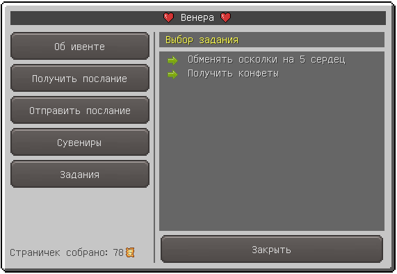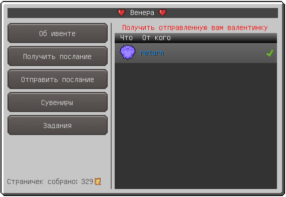 Возможность отправить другими игроками валентинки, прикрепя своё любовное пожелание. Никнейм получателя можно ввести вручную или выбрать, нажав на кнопку "Найти половинку