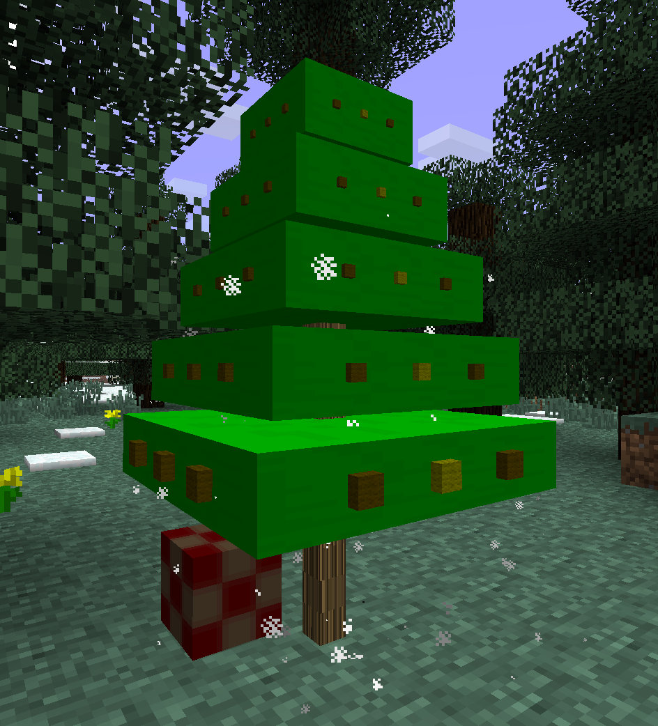 Изначально предмет, при пкм устанавливающий на поверхность блока недвижимую сущность в виде ёлки, которая становится 3 куба в высоту и 2 в ширину на север и восток от точки установки, отмеченной кубиком. На расстоянии 7 кубов ёлка оказывает лечебный эффект, постепенно восстанавливая здоровье всем расам, даже Т800. Запас исцеления не безграничен — израсходовав его, ёлка исчезает. Поскольку не является блоком, сквозь неё можно пройти с разбега и даже установить блоки в занятое ей пространство. Вручную удалить ёлку можно, разрушив блок под кубиком, но при этом она не выпадет, а просто исчезнет.