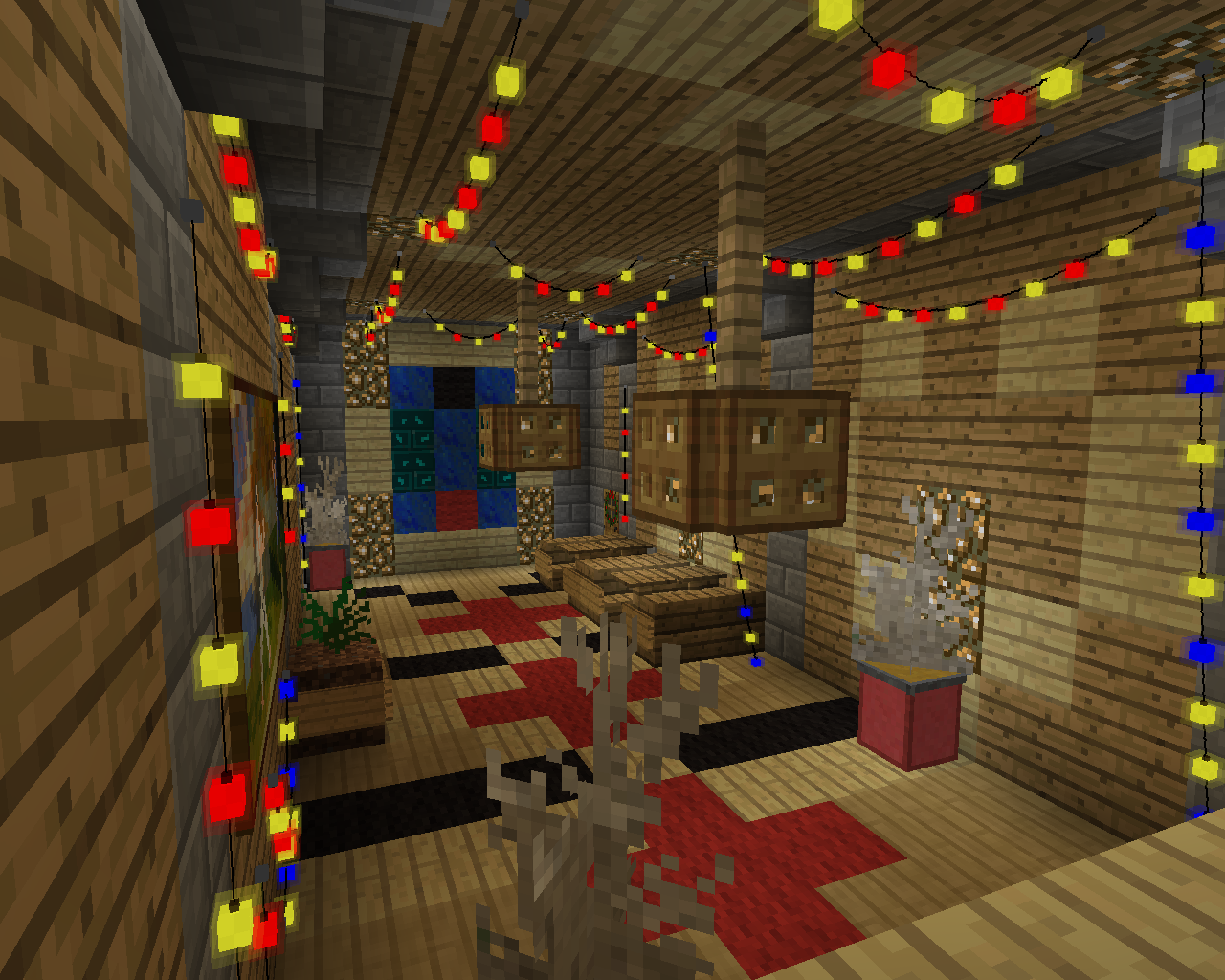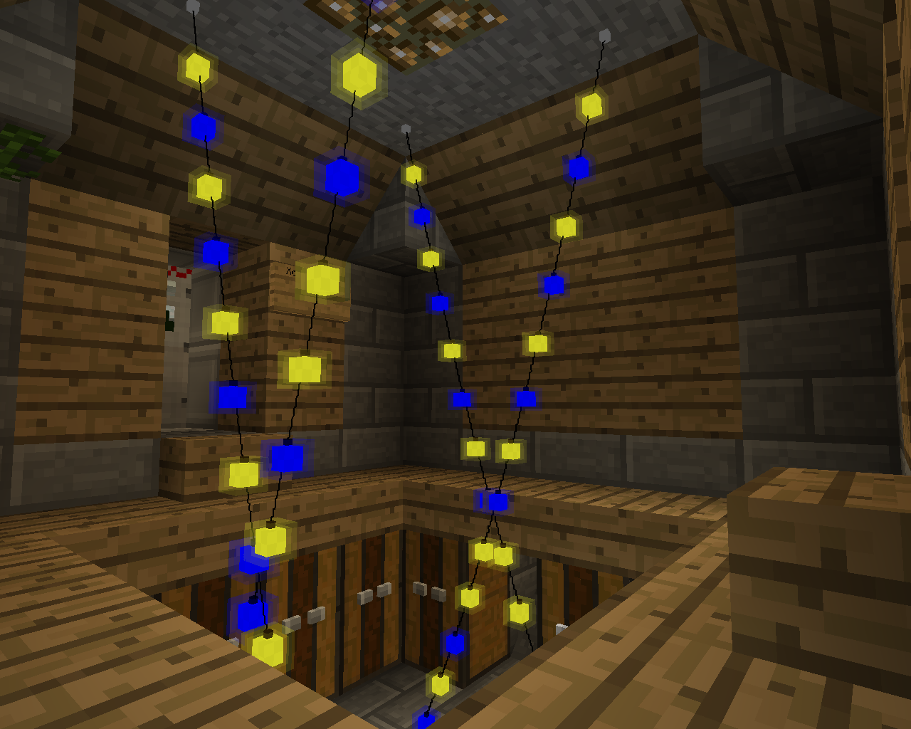 Для установки гирлянду нужно взять в руку, нажать ПКМ на начальном и на конечном блоках. Если поверхности находятся в одной плоскости и на пути между выбранными блоками нет преград, то между ними расположится гирлянда.