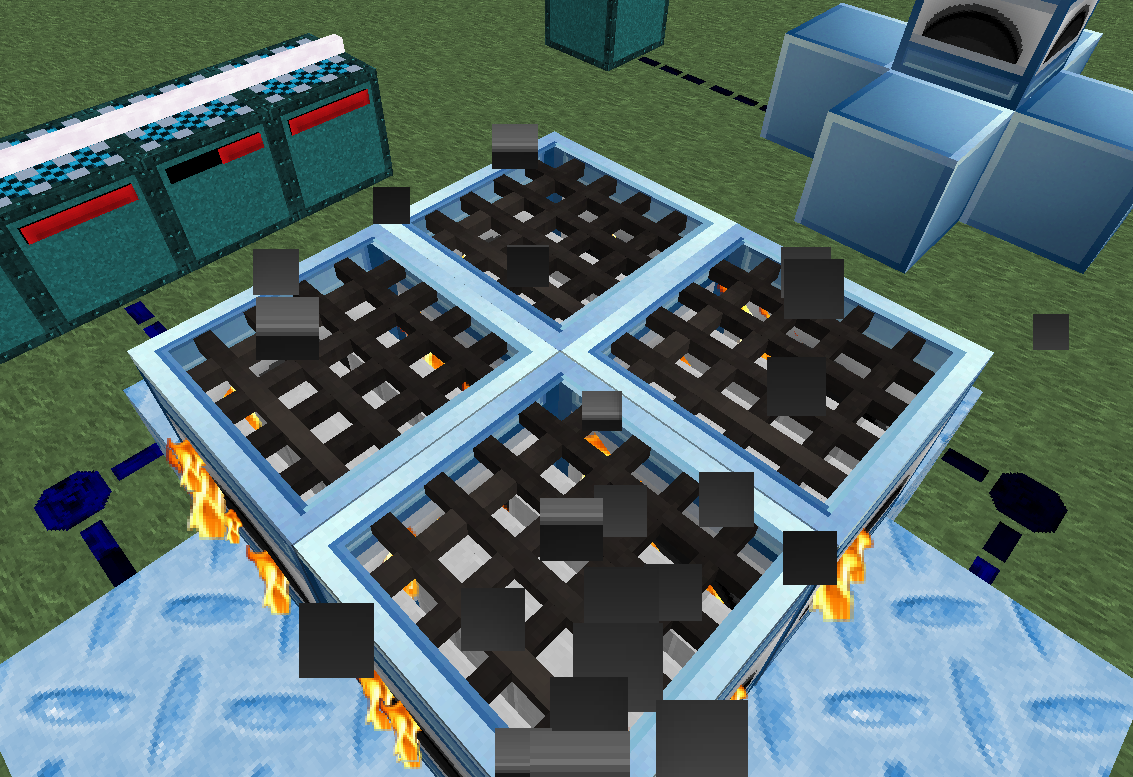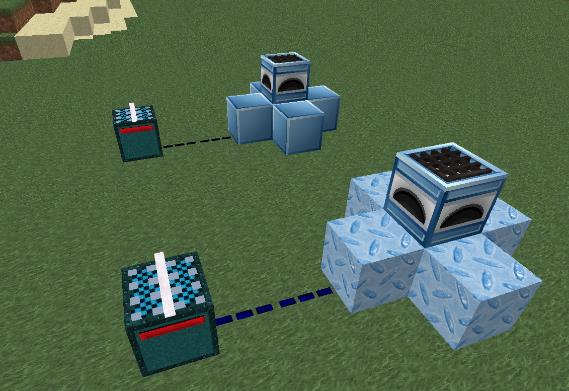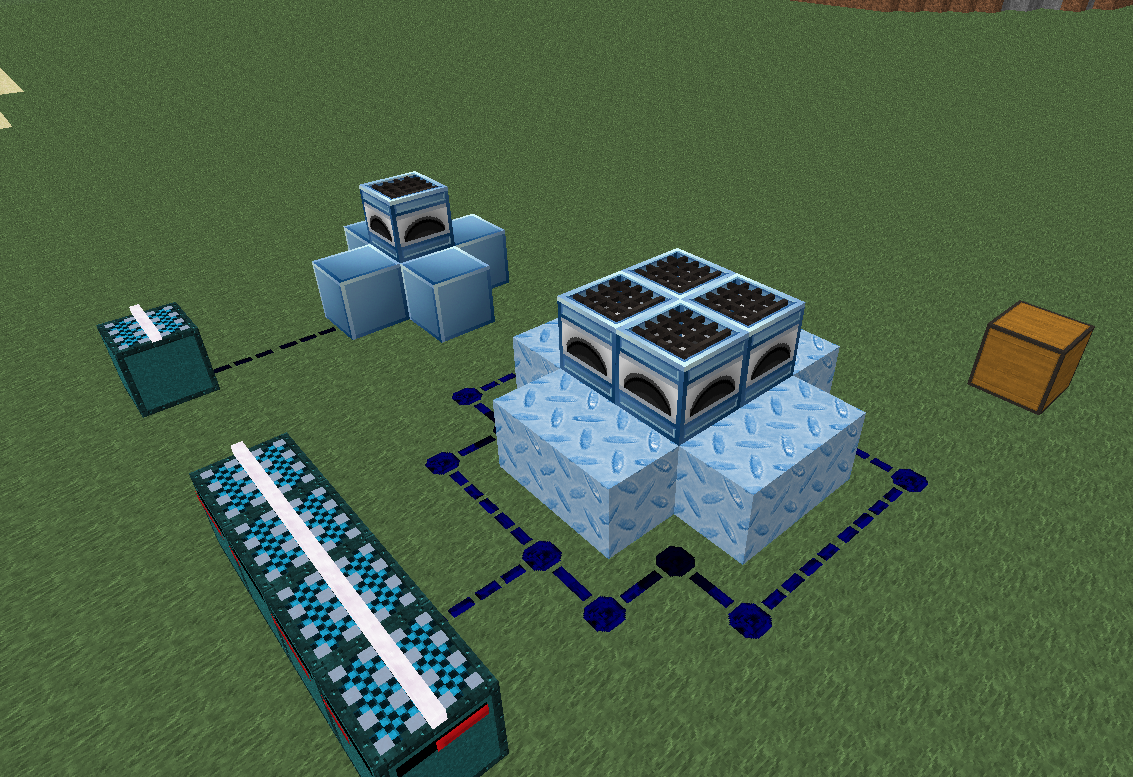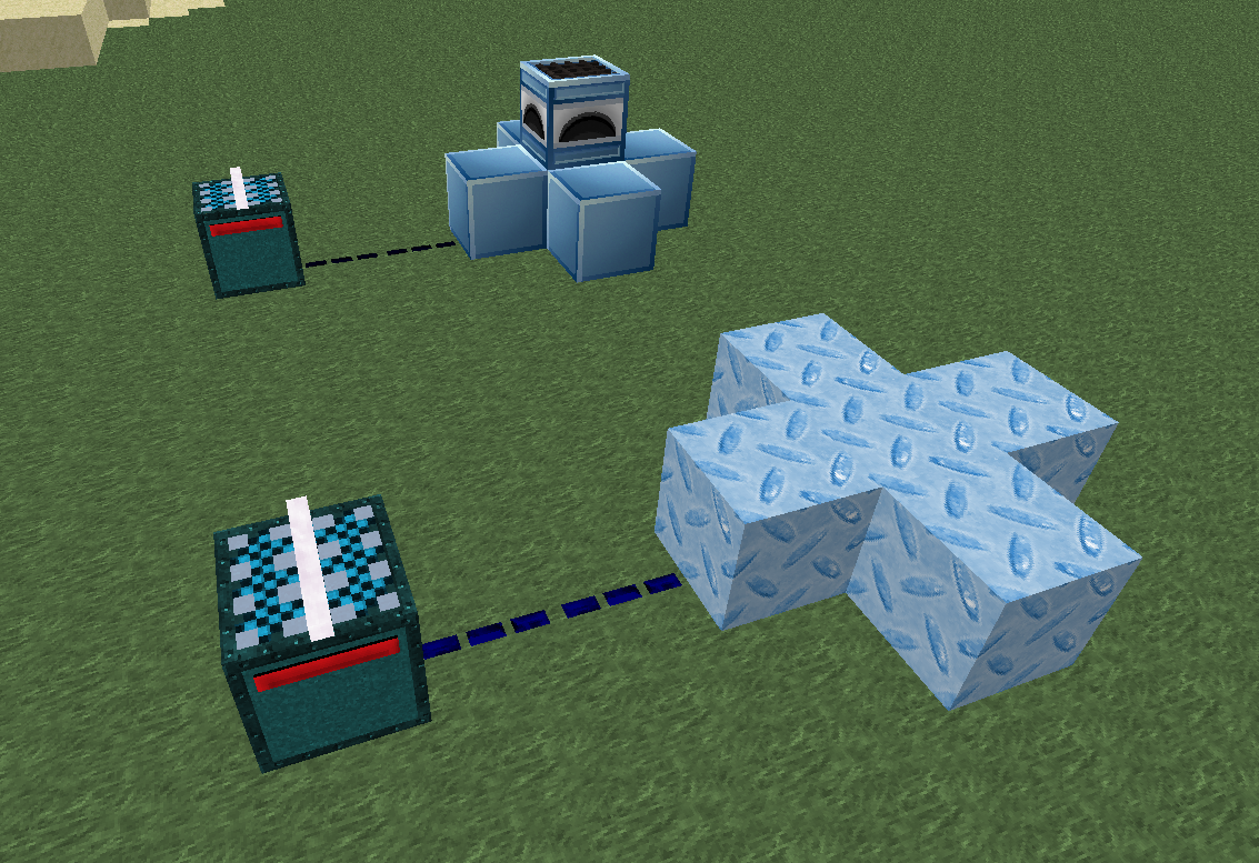 Для правильной работы дробителя необходимо построить крестообразную фигуру из блоков необработанной или обработанной стали, поставить блок дробителя по центру и подключить любой из доступных блоков стали к генератору с помощью проводов.