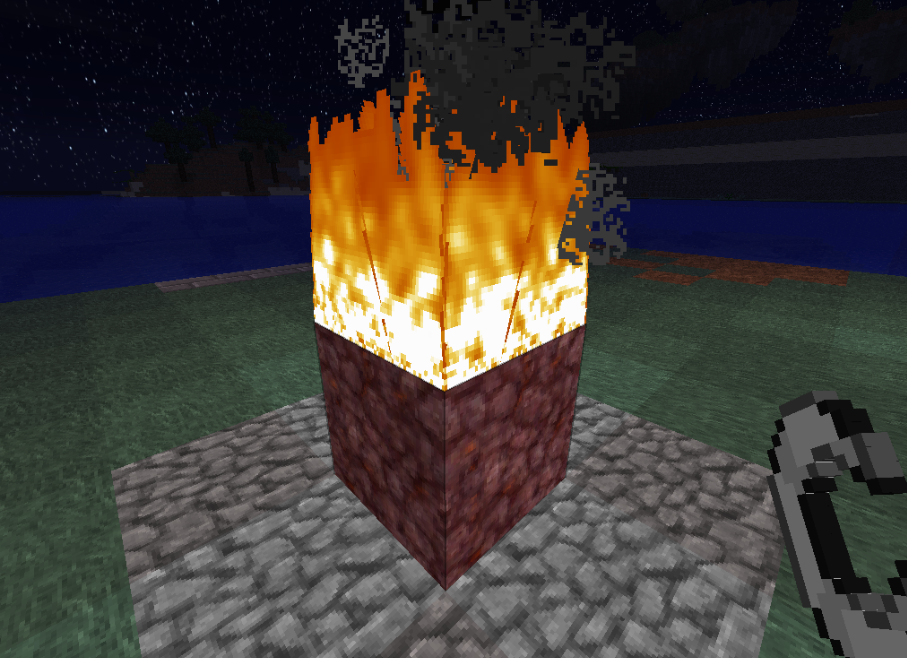 Мобы и игроки загорятся при попадании в огонь. Огонь будет немного загораживать обзор игрока и будет медленно наносить урон в размере 1 сердца в 1⁄2 секунды.