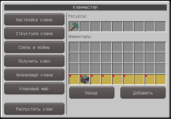 Хранилище клана изолировано текущим миром, т.е. положив ресурсы в своем клановом мире их нельзя будет увидеть и забрать в основном мире или тем более на другом сервере. Вместе с ресурсами сохраняется время и ник игрока, который его положил. При этом изымать ресурсы из хранилища может только лидер клана. При закрытии клана ресурсы из хранилища удаляются безвозвратно.