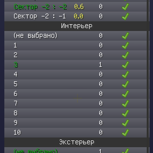 При этом серым обозначены не опубликованные сектора, для которых не считаются голоса. У судей же кроме этого меню открывается так же меню голосования за текущий сектор (если судья в нем находится) по пятью пунктам и оценками от 1 до 10. Судья может менять свои голоса по сектору только до рестарта сервера.