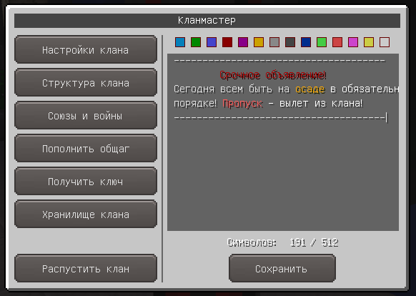 Animix Добавлена возможность создавать клановые объявления: текст не более 512 символов с возможностью перекрашивания в разные цвета. Создавать их может любой член клана с привилегией "новости". Объявление выводится в клановом чате при каждом входе на сервер в течении 24х часов и до ближайшей перезагрузки сервера. Любое обновление текста автоматически продляет его до 24х часов: